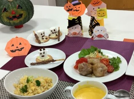 親子で協力してハロウィンに合わせた料理を習います。