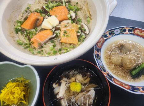 内容 | 茸のすまし汁、里芋唐揚げ 鶏そぼろ餡、鮭のバターご飯、かきのもとのお浸し サービス(漬物胡瓜のからし漬け、大根のべったら漬け) |