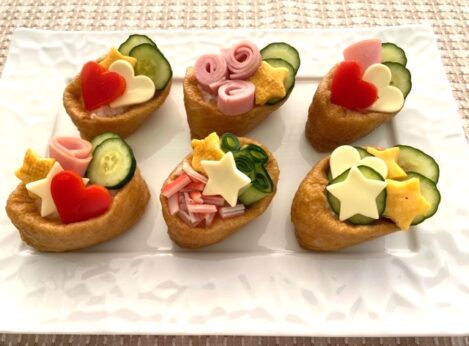 内容 | オープンいなり、鶏肉と卵のさっぱり煮、青菜の和え物、フルーツ白玉 |
