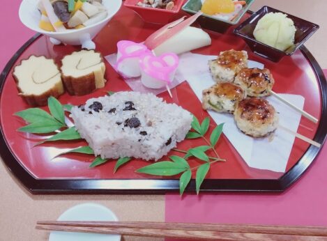 | 内容 | 黒豆ご飯、ピーナッツ入り田作り、のっぺ、ひじき入りふわふわつくね、紅白なます、伊達巻、フルーツきんとん茶巾絞り |