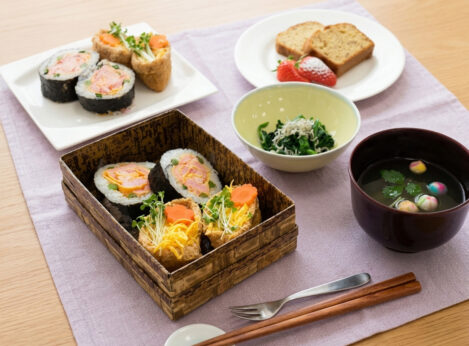 内容 飾り巻き寿司バラのデコロール、カラフルいなり、ほうれん草とじゃこのおひたし、おすいもの、簡単バナナパウンドケーキ