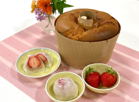 内容 ①5/19 県内産米粉のバニラシフォンケーキ、いちご大福
