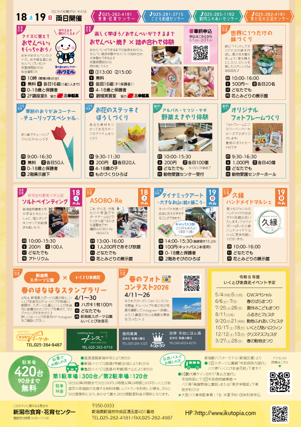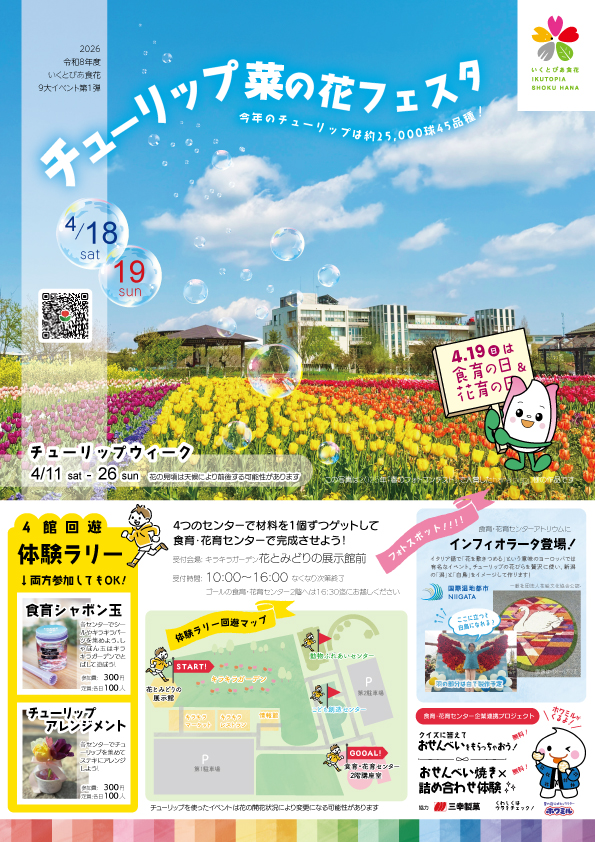 | 内容 | 令和8年度のいくとぴあ食花9大イベントの第1弾! 新潟市の花チューリップと菜の花が見頃となる時期に、たくさんのイベントを用意して皆さまのお越しをお待ちしています! |