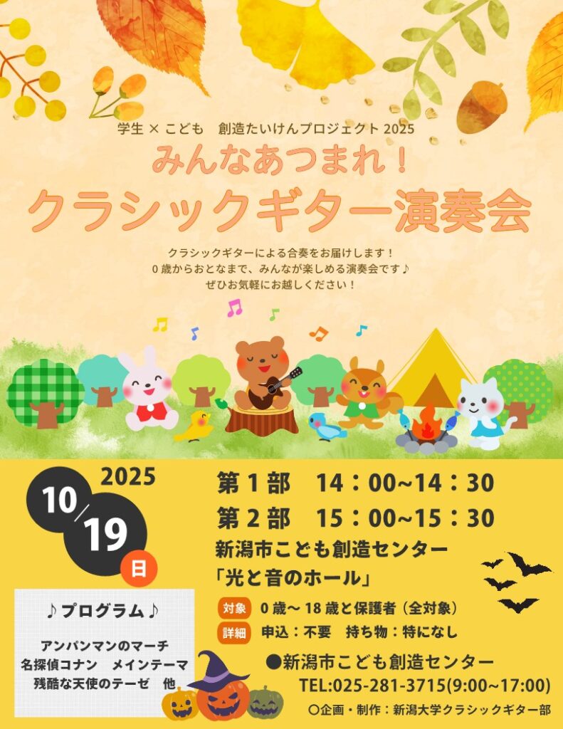 内容 | クラシックギターによる合奏をお届けします。0歳から大人まで、みんなが楽しめる演奏会です。 |