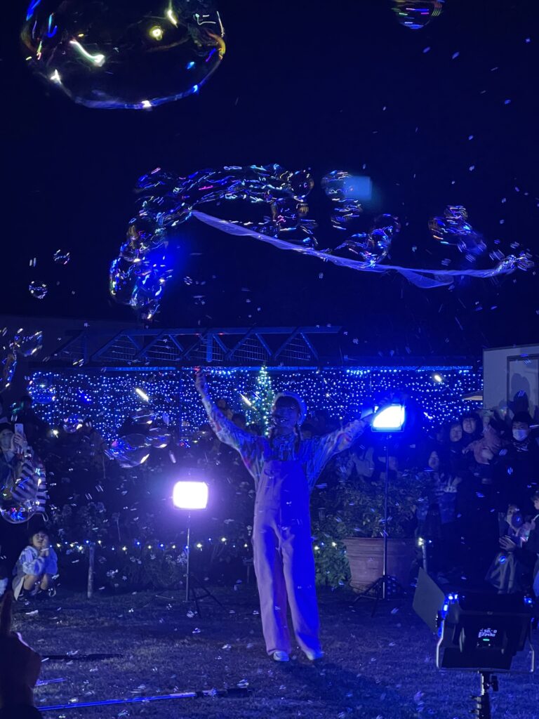 イルミネーションの光に照らされ、色とりどりに輝く幻想的なしゃぼん玉ショーを開催します!