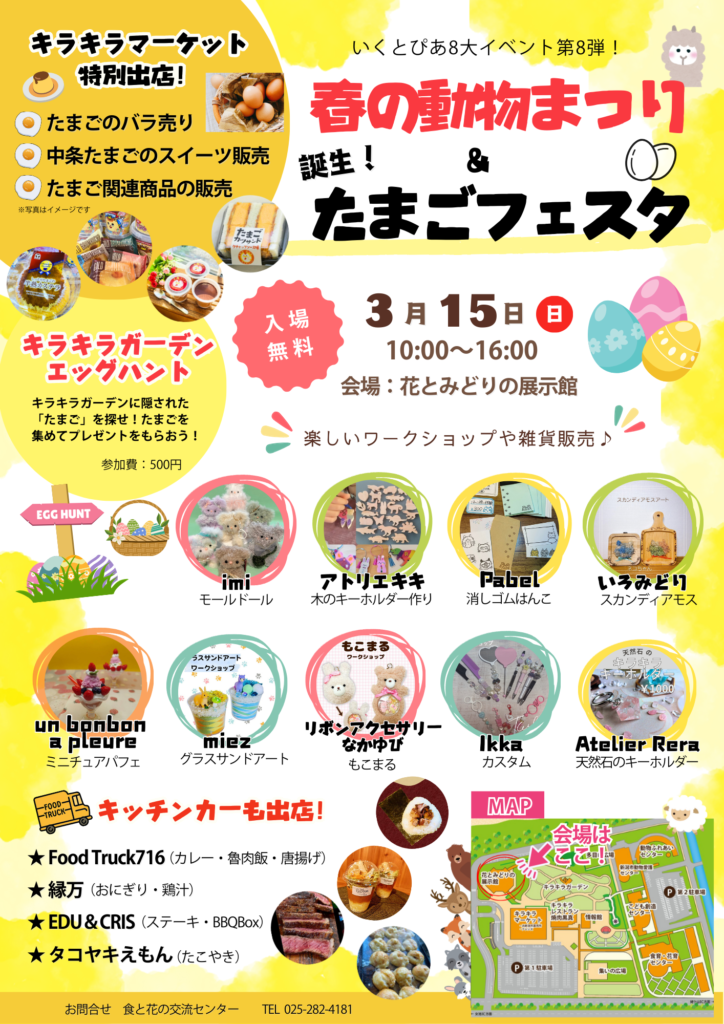 家族で楽しめるワークショップや雑貨販売、キッチンカーが出店します。 また、キラキラマーケットの特別出店では、新鮮たまごのバラ売りや中条たまごのスイーツを販売!