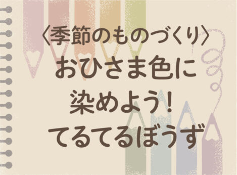 | 内容 | 障子紙でつくったてるてるぼうずのすそを色水で染めます。乾燥のため約1時間程度かかります。作品が生乾きだった場合ビニール袋に入れておわたしします。 |