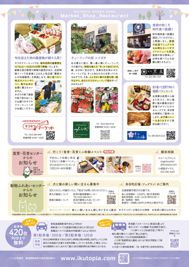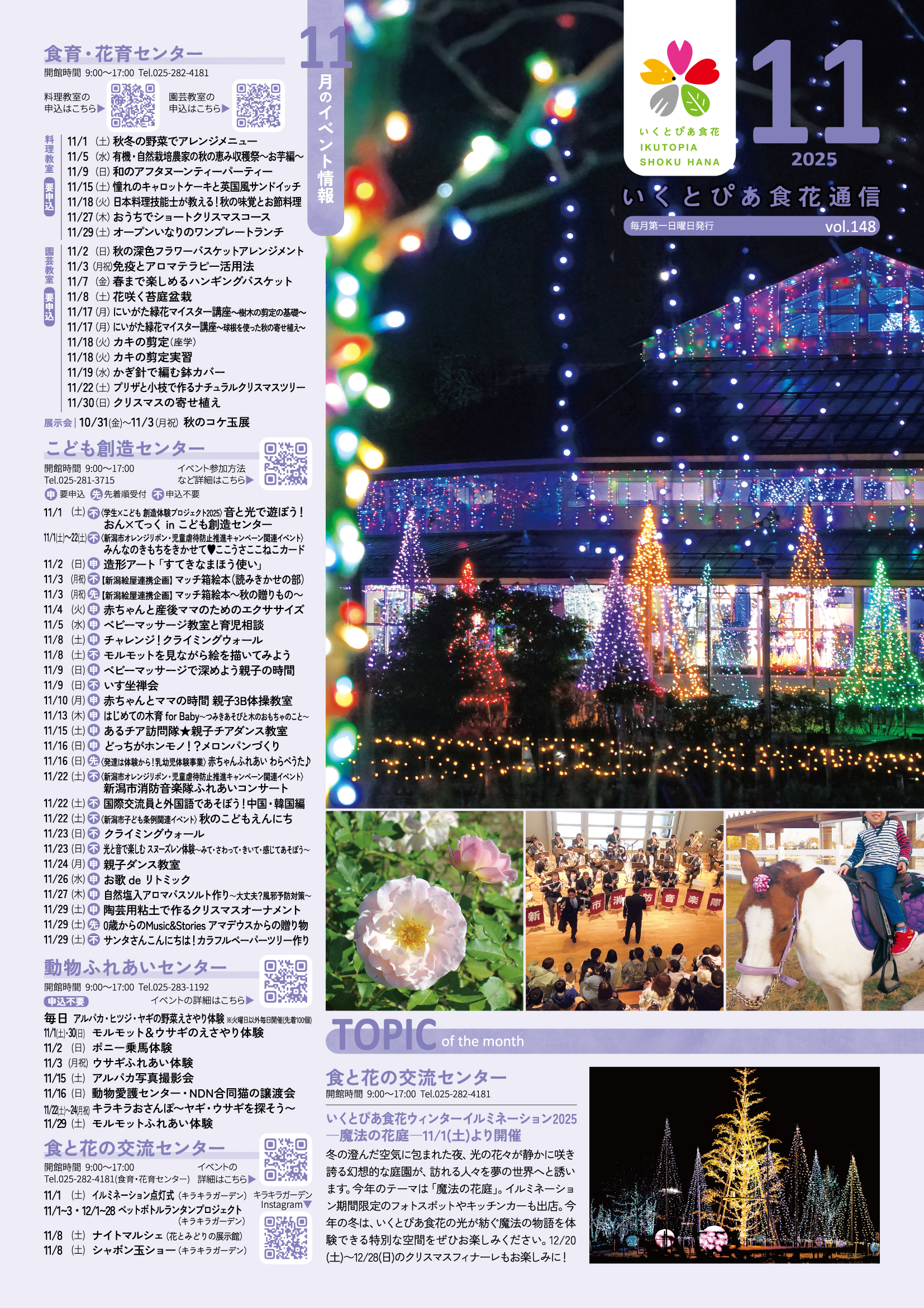 いとぴあ食花通信2025年11月号 食育・花育センター、こども創造センター、動物ふれあいセンターほか、新潟市公共施設で配布しています。 11月の要申込イベントへのお申込、お待ちいたしております!