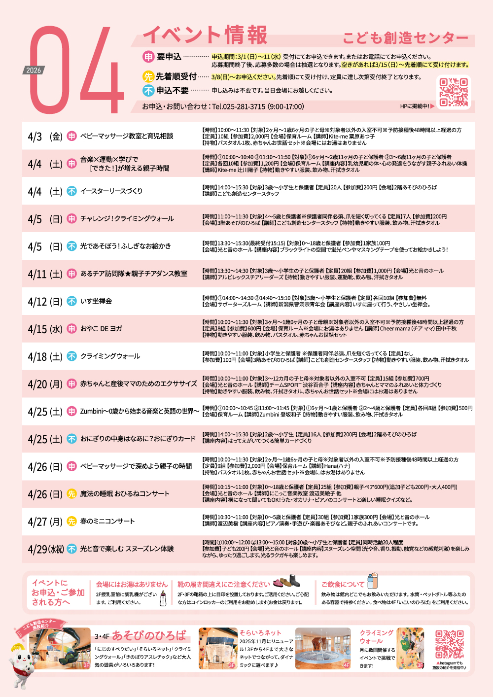 2026年4月のイベント一覧です😊 要申込のイベント受付スタート!! ぜひチェックしてくださいね😉 先着順受付は3/8(日)よりスタートです✨