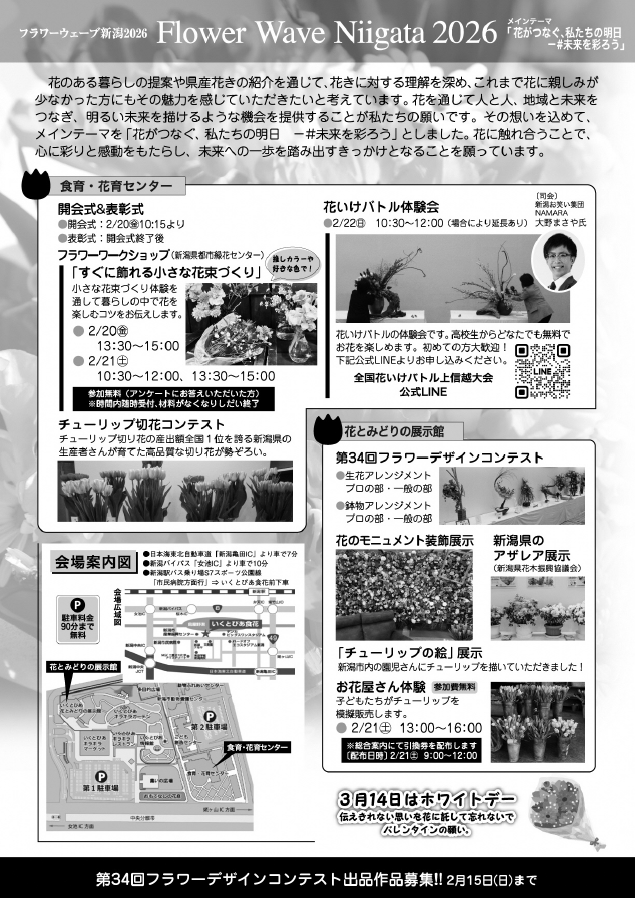 チューリップの切り花コンテストや、フォトスポットにもなる華やかな花のモニュメント、フラワーデザインコンテストの作品展示など、花のある暮らしの提案や新潟県産の花きの紹介を通して