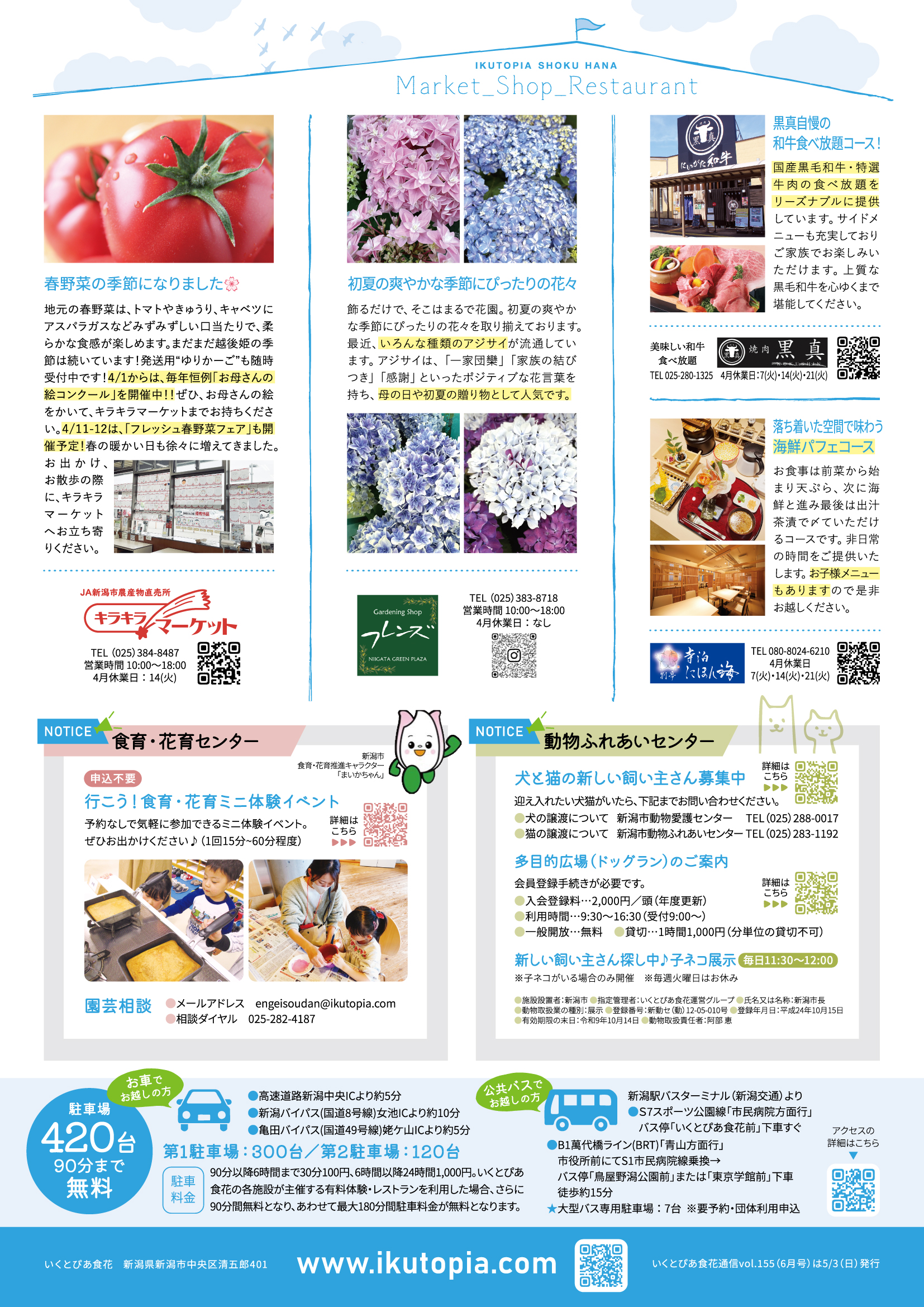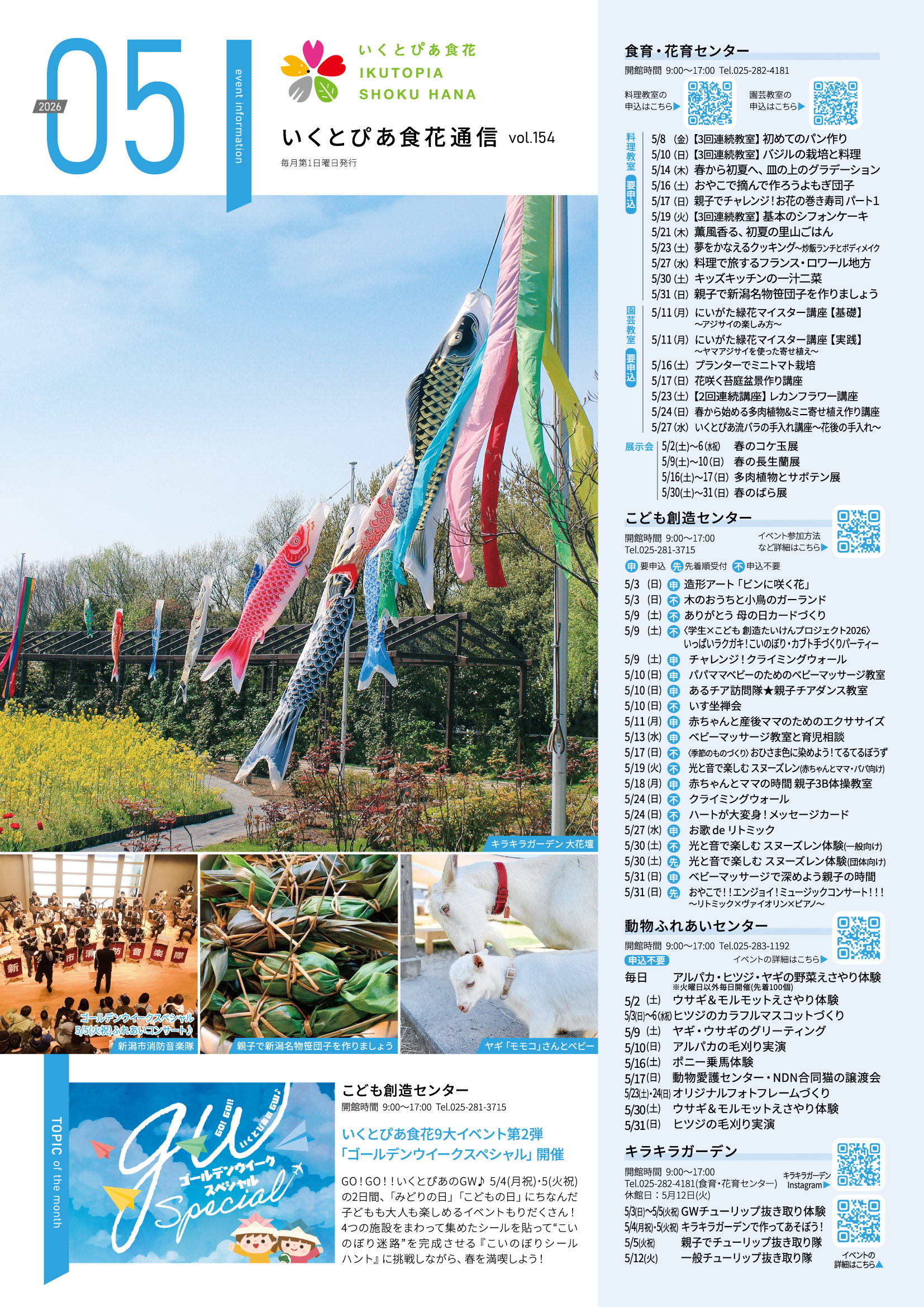 いとぴあ食花通信は、食育・花育センター、こども創造センター、動物ふれあいセンターほか、 新潟市公共施設で配布しています。 要申込イベントへのお申込、お待ちいたしております!